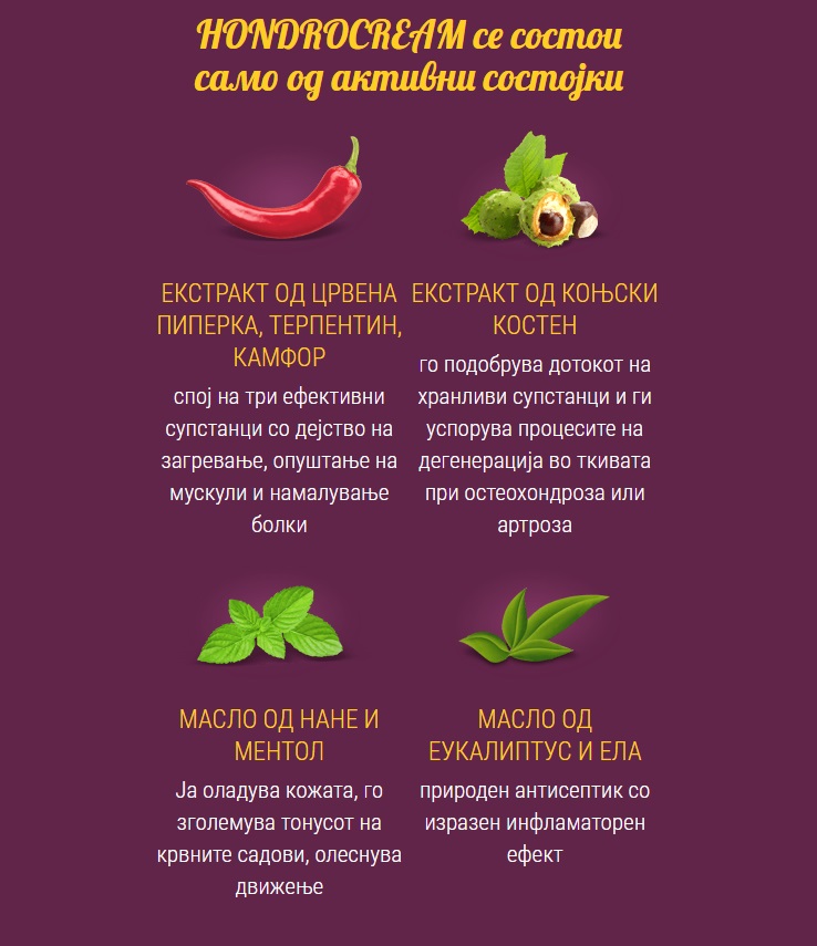 Кога го прашав докторот за Hondrocream, не добив разумен преглед, не реагирав добро или лошо. Лекарот не можеше да слушне, веројатно. Решив да се обидам во секој случај, бидејќи тоа беше создадено на Институтот за ревматологија, и ми се допадна. Мојот грб престана да му наштети, сега се наведнувам нормално, и нема болни сензации, ветувањата се вистинити, а не измама.